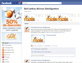 A Gol, a segunda maior do mercado, está prestes de atingir 300 mil pessoas que já curtiram sua página. No último final de semana, a empresa usou o canal para divulgar promoção que vendeu passagens para todos os seus destinos com 50% de desconto. Tinha bilhete pela metade o preço até para a ilha de Fernando de Noronha.