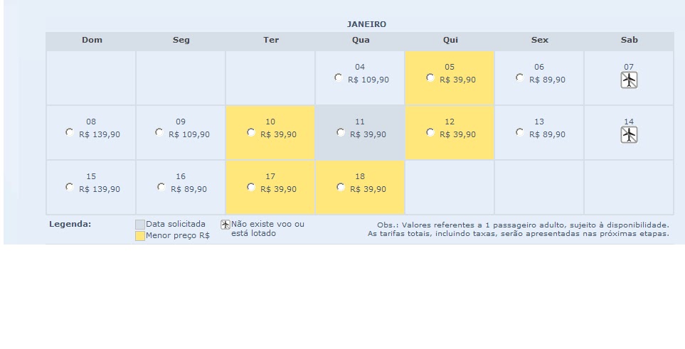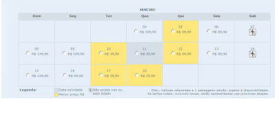 Já a Webjet que há um bom tempo não fazia uma promoção interessante, veio com força desta vez. A companhia que foi vendida para a Gol está vendendo passagens para viagens entre 15 e 30 de janeiro, mês de férias, por R$ 71,99 de Uberlândia, no Triângulo Mineiro, para o Galeão, por R$ 71,99. Tem ainda Confins/Brasília por R$ 84,99.