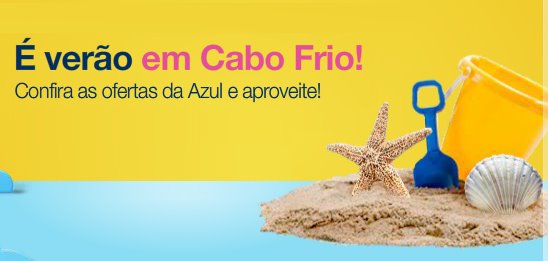A Azul está vendendo passagens até sexta-feira (16) por R$ 29,90 para os voos que partem de Confins para Cabo Frio (RJ). A nova ligação será a partir de 25 de dezembro no turboélices ATR-72. A promoção vale para viagens entre os dias 25 e 31 de dezembro.
