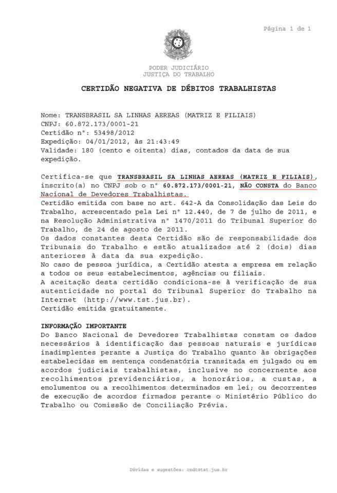 Nesta semana uma certidão negativa de débitos, publicada no Facebook nos “Amigos da Saudosa Transbrasil”, causou surpresa entre os ex-funcionários. Pelo documento, a empresa não tem mais dívida trabalhista, o que facilitaria a venda da marca.