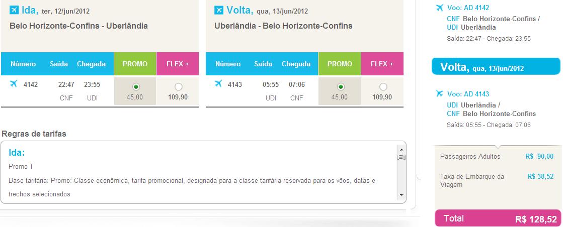 As companhias Gol, Azul e Webjet estão vendendo passagens a partir de R$ 43 (trecho) para viagem no Dia dos Namorados. De Confins para Uberlândia, no Triângulo Mineiro, é possível encontrar no site da Azul tarifas por R$ 45 para viagem no dia 12 de junho e retorno no dia 13 do mesmo mês.