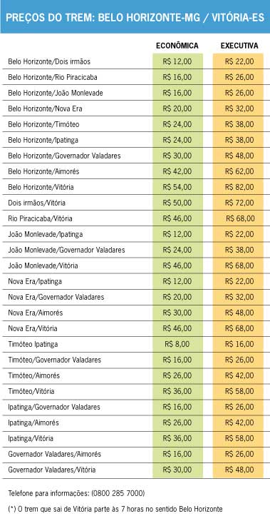 A viagem de Belo Horizonte até Vitória custa R$ 54 na classe econômica e R$ 84 na executiva, classe equipada com ar-condicionado e poltrona que inclinam. O trem tem restaurante que serve almoço, salgados e sanduíches. Bebida alcoólicas não vendidas e não podem servida a bordo. Nos vagões é proibido fumar, inclusive nas varandas.