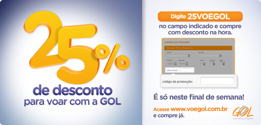Para conseguir as passagens promocionais é preciso digitar o 25VOEGOL no espaço “código promocional”. Mas para conseguir o desconto é preciso comprar a ida e a volta.