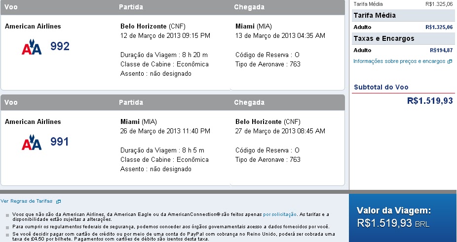 Preço Confins/Miami com as taxas de embarque
