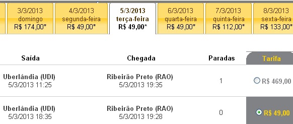 Uberlândia/Ribeirão Preto com cada trecho vendido por R$ 49. De Uberlândia para