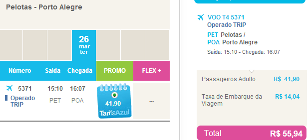 site passagens por R$ 41,90 (trecho). Uma dica para você encontrar esses valores. A cidade de Pelotas só aparece na lista de destinos da Azul/Trip se você fizer uma simulação, por exemplo, Confins/Santos Dumont, para viajar em março. Como a venda desse novo destino ainda não foi divulgada, o códido da cidade (PET) so aparece para viagem no mês que vem.