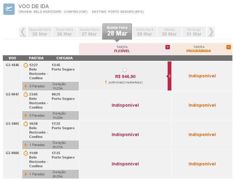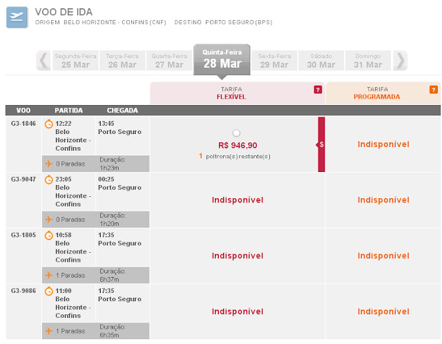 Site da Gol mostra que há apenas um lugar de Confins/Porto Seguro