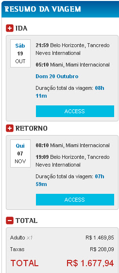 Os voos da TAM para Miami a partir de Confins são diretos. Se o embarque for em Guarulhos, a passagem para esse mesmo destino sai por R$ 905, enquanto o preço a partir de Confins é de R$ 733. Esses valores são por trecho e não incluem as taxas de embarque.