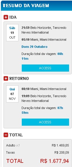 Os voos da TAM para Miami a partir de Confins são diretos. Se o embarque for em Guarulhos, a passagem para esse mesmo destino sai por R$ 905, enquanto o preço a partir de Confins é de R$ 733. Esses valores são por trecho e não incluem as taxas de embarque.