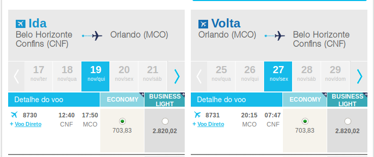 Orlando para viagem no mês de novembro.  Os voos serão com frequências às segundas, quartas, quintas, sextas-feiras e aos domingos até 13 de dezembro, quando passarão a ser diários