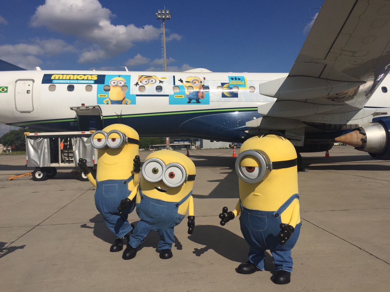 A Azul Universal Pictures realizaram nesta semana um evento para receber uma das aeronaves da companhia, modelo E195, matrícula PR-AYJ, personalizada com imagens dos personagens do filme Minions. A ação ocorreu no Aeroporto Internacional de Viracopos, em Campinas, e marcou a chegada dos Minions ao Brasil.