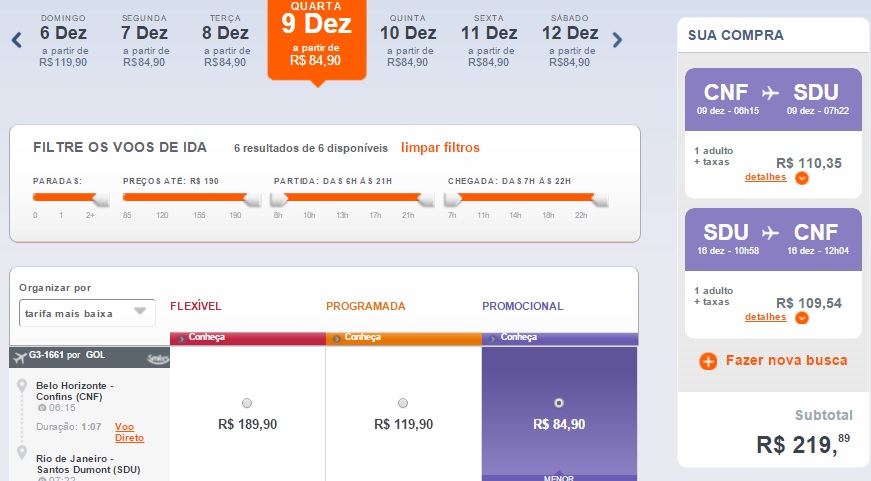 Na promoção da Gol é possível encontrar passagens por R$ 84,90 de Confins para o Santos Dumont. Na ponte aérea Rio São Paulo a companhia está vendendo passagens por R$ 97,90. As tarifas da Gol estão disponíveis para viagem nos meses de novembro e dezembro, mas também há tarifas promocionais para janeiro e fevereiro de 2015.