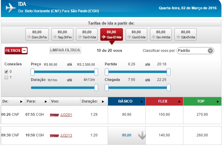 De Congonhas (SP) para Confins (MG) encontramos tarifas por R$ 86,90 na ida ou volta nos voos da Gol. Na promoção da TAM há várias opções de tarifas por R$ 80 de Confins para Congonhas ou para Guarulhos, na Grande São Paulo. De Uberlândia para Congonhas a Gol lançou passagens por R$ 95,90 na ida ou volta.
