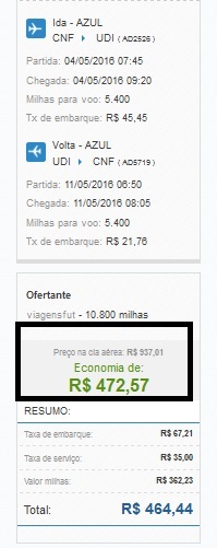 Pela Azul é possível garantir uma economia de R$ 472,52 na compra das passagens para viajar em voo direto para viagem na mesma data. Vamos explicar como isto é possível. Para emitir os bilhetes de ida e volta de Confins para Uberlândia são necessários 10.800 pontos do Tudo Azul, programa de fidelidade da Azul. Se você comprar essas milhas no mercado, vai gastar R$ 464,44, ou seja a economia será de R$ 472,52, conforme mostra a imagem ao lado. As tarifas de embarques estão incluídas.