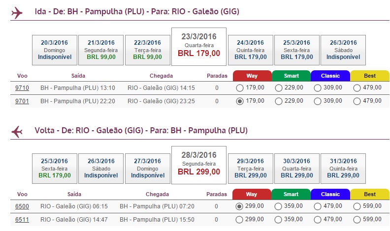 Quem pretende viajar até 22 de março do Aeroporto da Pampulha, em Belo Horizonte, para o Galeão (RJ), encontra passagens por R$ 99 na ida ou na volta. De Uberaba ou de Ipatinga para Belo Horizonte a companhia está vendendo passagens por R$ 149. Para o feriado da semana Santa Santa a Flyways lançou tarifas por R$ 179 da capital mineira para o Rio de Janeiro. Para embarque em Ipatinga e Uberaba para o Galeão, com troca de aeronave na Pampulha, vai pagar R$ 248 para viajar para o Rio de Janeiro na quinta-feira (24/03) na sexta-feira (25/03). As tarifas de embarques não estão incluídas na promoção.