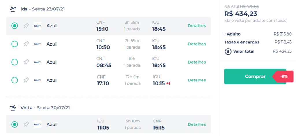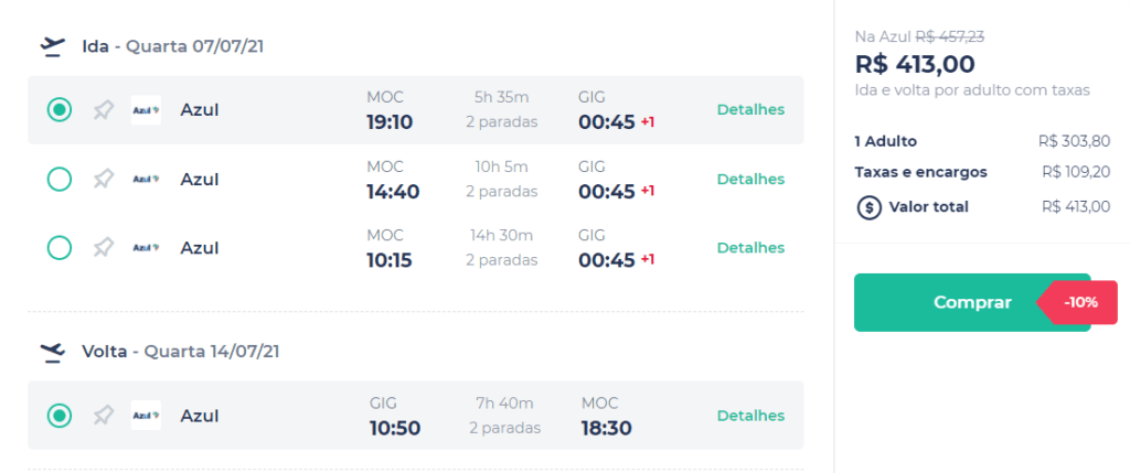 O destaque fica por conta do trecho de ida e volta mais taxas para o Rio de Janeiro, por R$413, conforme detalhes na imagem acima.