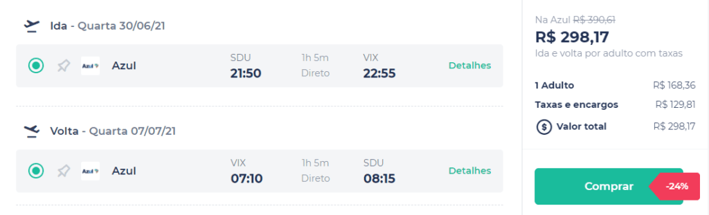E, para quem sai da capital fluminense, também há boas opções de voos para quem está programando as férias. Entre as ofertas de hoje, estão passagens de ida e volta mais taxas para Belo Horizonte, por R$283, Vitória, por R$298 (veja detalhes na imagem acima), Brasília, por R$324, e Salvador, por R$365.