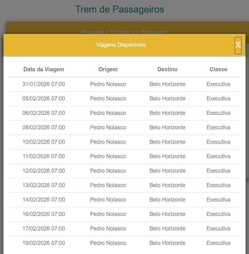 No vagão da classe econômica há vagas de Belo Horizonte para o Espírito Santo para viagem do dia 14 a 19 de fevereiro. Todas as passagens para o dia 13 foram vendidas. Em quase todas as datas há vagas no trem Vitória-Minas saindo de Cariacica para o período do Carnaval de 2026.