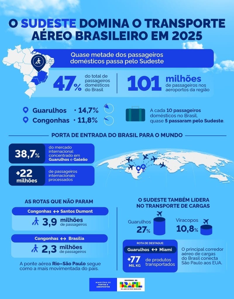 O mapa da aviação brasileira em 2025 teve um centro bem definido. Os aeroportos da Região Sudeste responderam por cerca de 47% de todos os passageiros do mercado doméstico ao longo do ano, segundo dados do Ministério de Portos e Aeroportos, com base em levantamento da Agência Nacional de Aviação Civil. Ao todo, 101 milhões de pessoas passaram pelos terminais da região, número que reforça a concentração das principais rotas e operações aéreas do país.